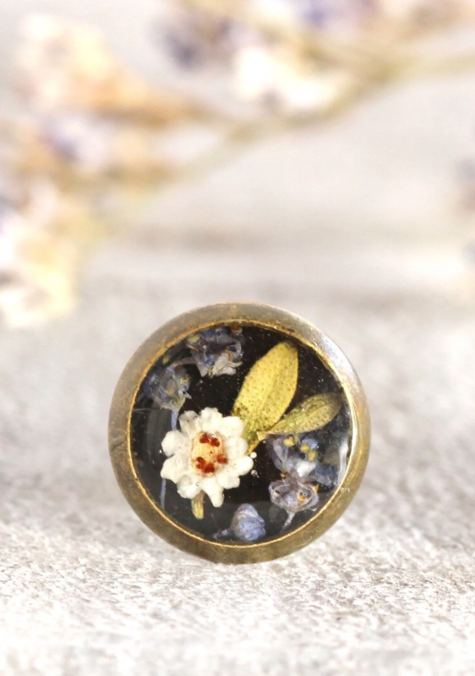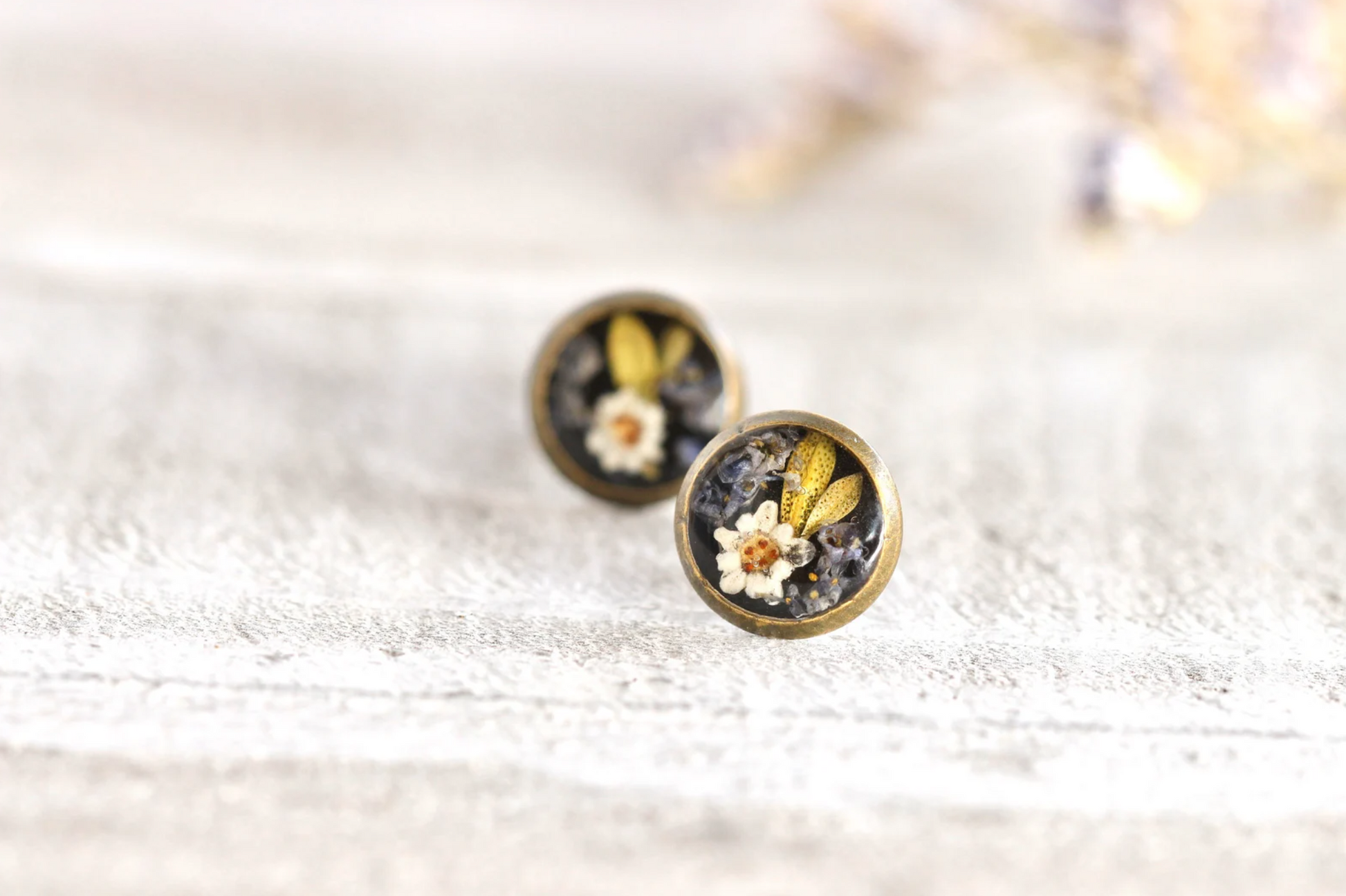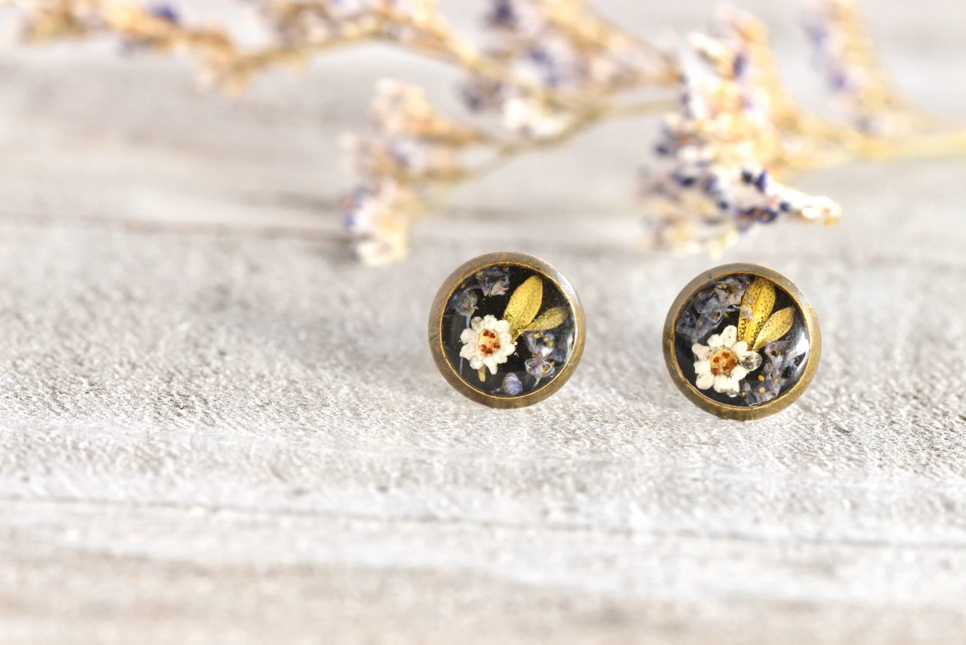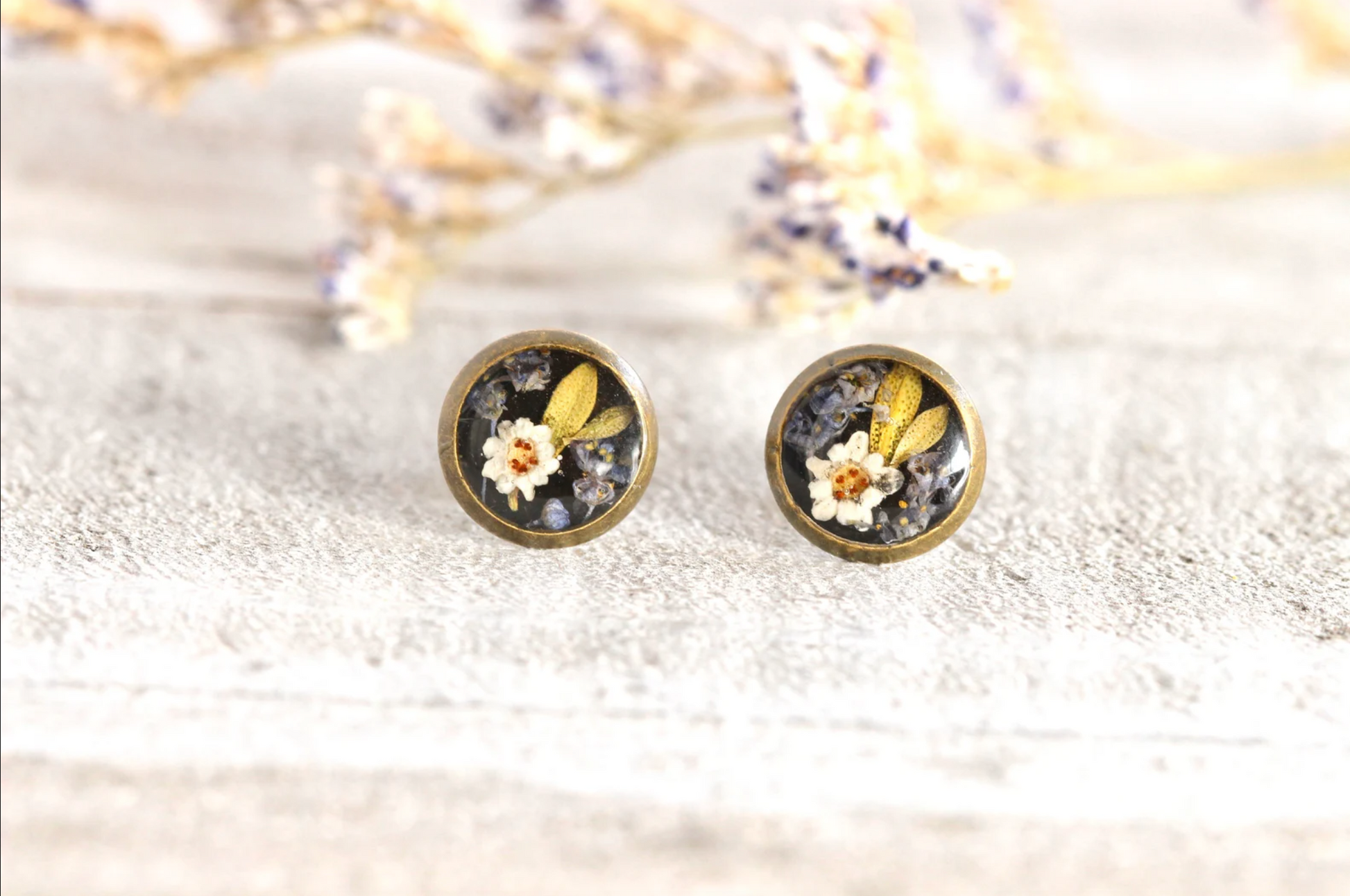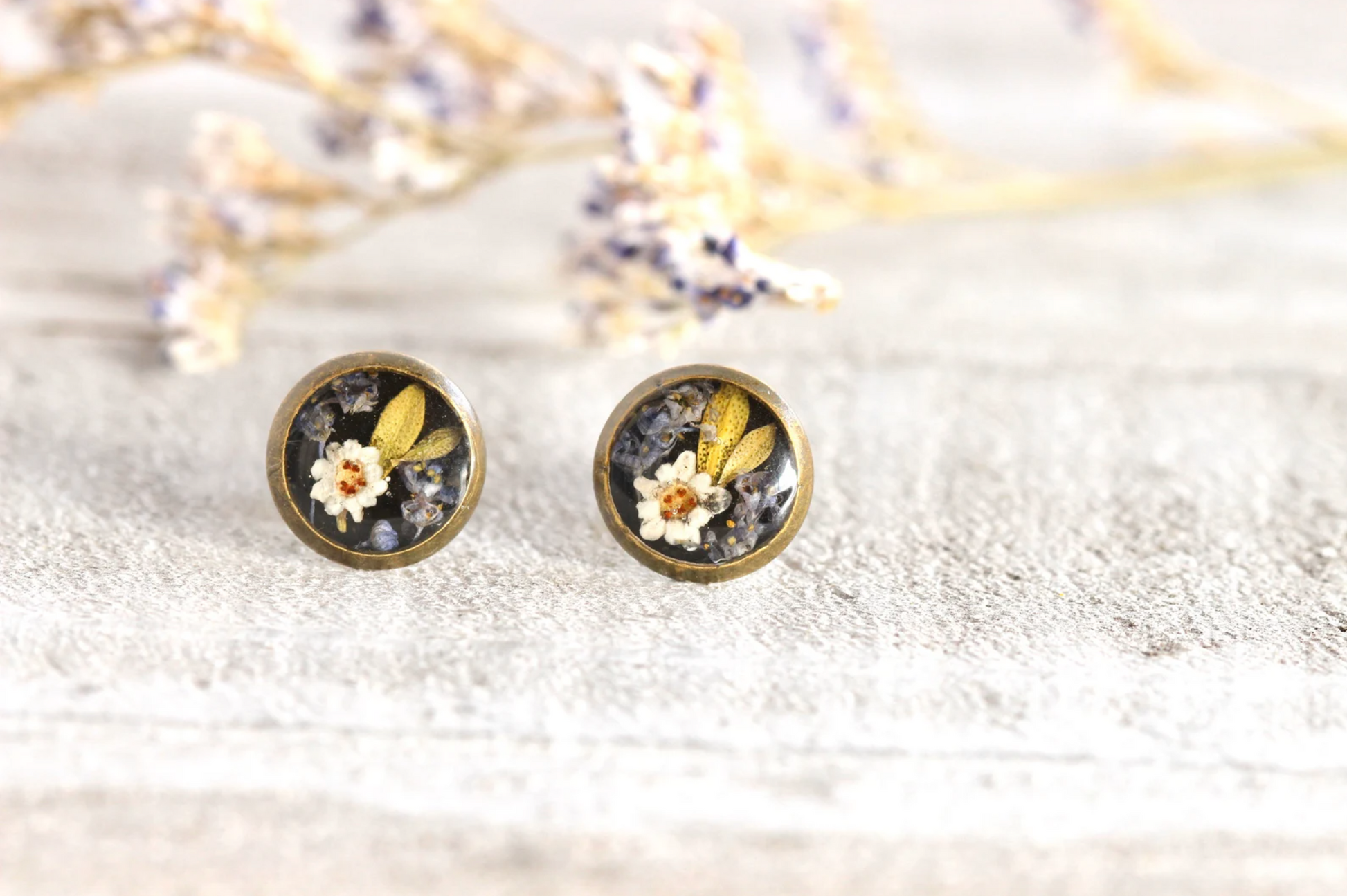 Handmade earrings comes with real flowers in antique bronze metal earring studs.